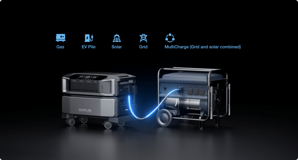 You're spoilt for choice with EcoFlow DELTA Pro Ultra's charging options. As well as all our usual methods, like solar and the grid, you can now power up using a gas generator or even your EV charging pile. With the industry's fastest charging speeds of 8800W, top up two batteries in only 2 hours.